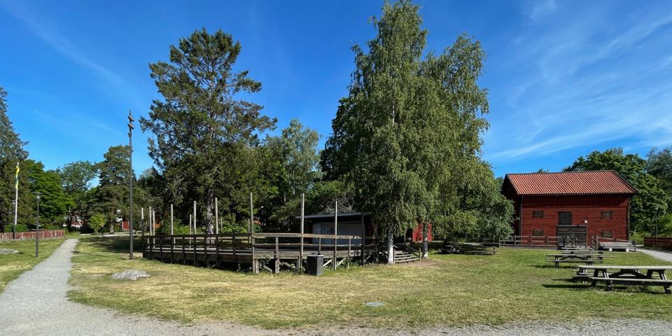 Runtom paviljongen finns picknickbord för till exempel spel, loppmarknader och kreativa workshops. Vid regn kan borden bäras in under tak.