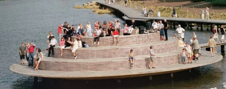 Runtom dansbanan byggs permanenta sittplatser som kan användas av publik vid olika evenemang. För barnen tillkommer sittmöbler i mindre storlekar.