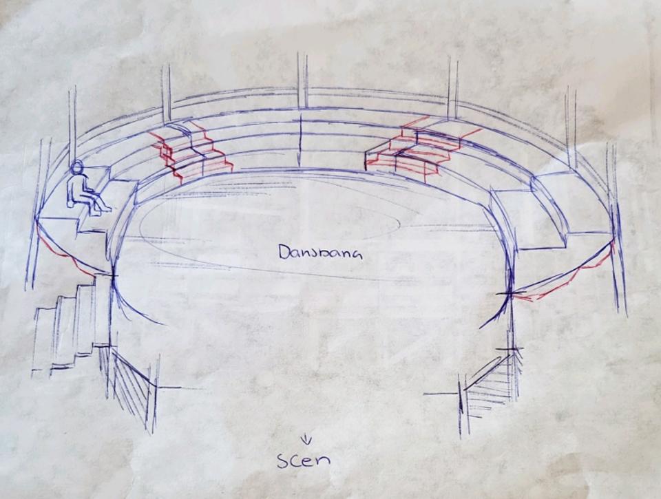 Längs kanten av dansbanan byggs en läktare eller trappor med sittplatser, lite liknande en amfiteater.