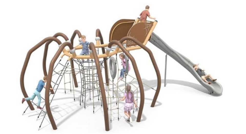 På platsen byggs en lekplats med en klätterställning. Klätterställningen har olika höjder, former och utmaningar så att barn i olika åldrar kan leka, klättra och utforska tillsammans.
